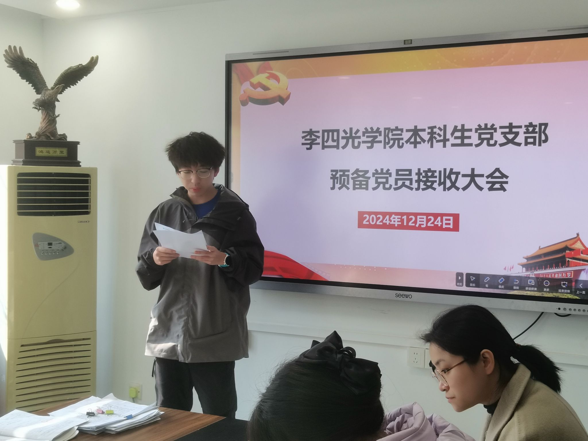 (通讯员 刘童)为了进一步壮大党的力量,加强党的组织建设,为党注入了新鲜血液,增添新活力,保持党的生机与活力,在党的光辉照耀下,2024年12月24日中午12:00,betway西汉姆联官网本科生党支部于行政楼215成功开展了预备党员接收大会。参会人员有betway西汉姆联官网本科生党支部全体党员。会议由betway西汉姆联官网本科生党支部纪检委员付晨曦同志主持。