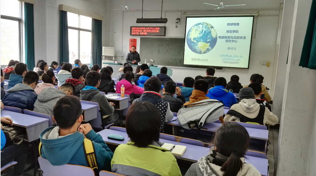 最后,胡老师向大家详细介绍自己的研究方向及所带课题组所取得的成绩,并与同学们热情的进行了互动交流,耐心细致的回答了学生们提出的感兴趣问题,鼓励学生们尽快的培养兴趣,打好基础,能更快更好的投入到地球物理专业的学习和科研工作中,勇担历史使命!