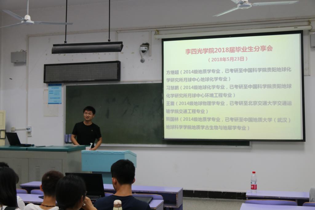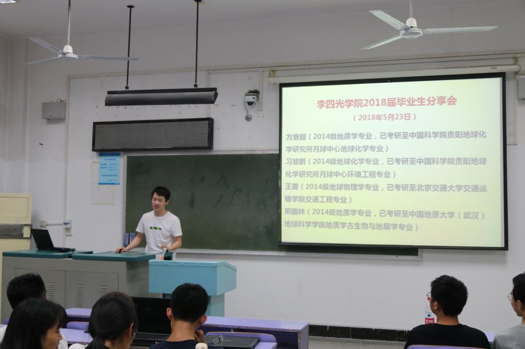 紧接着上场的是已考研至中国科学院贵阳地球化学研究所月球中心地球化学专业的方继超同学。他几乎为大家教科书般展示了一位高智商“学渣”的逆袭经历,同样提出了转折点的重要性,分享了自己大学前期惨淡的绩点与破釜沉舟的考研之路,与大家共勉。