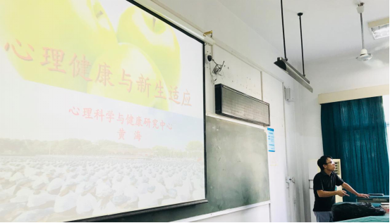 黄老师首先向大家介绍了心理健康的含义以及心理健康的几点标准,并结合大学新生常见的一些不良适应心理,给同学们做了详细的介绍以及应对办法。此外,黄海老师还和大家说明了常见的心理问题和心理疾病的区别。心理问题是某段时间由于情绪波动导致的短暂性问题,可以通过自身心态调节、心理疏导等方式加以解决;但心理疾病就是一种疾病,需要结合药物治疗以及心理疏导。黄海老师呼吁大家,一定要重视心理健康问题,一旦发现问题要及时寻求帮助,同时黄海老师也向大家介绍了学校关于心理咨询方面的相关内容。