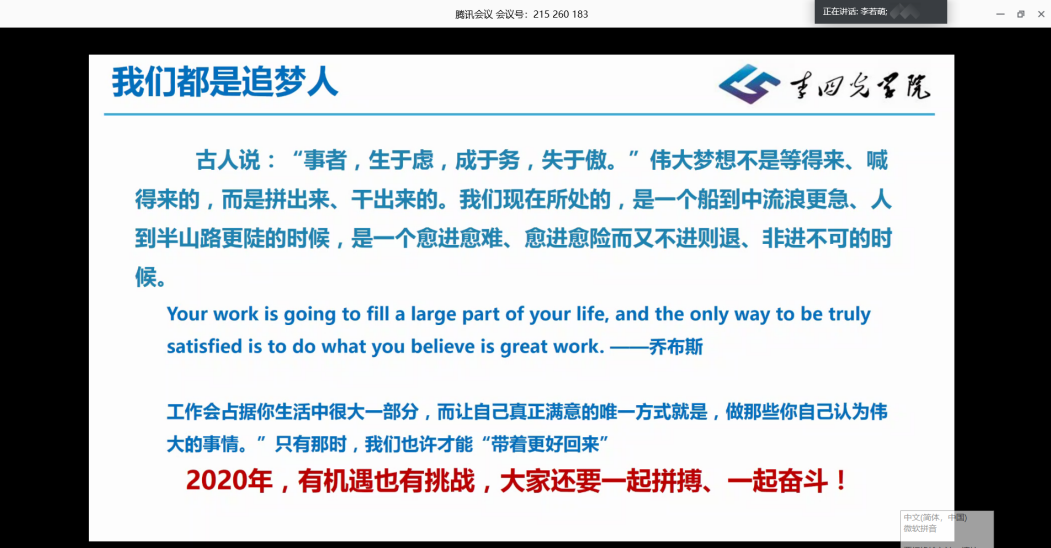 本次年级大会包括2017级学生概况介绍、学业成绩及教务工作汇总、针对近期重点问题梳理以及师生交流四个方面,本次年级大会的召开正值2017级同学即将步入大四阶段的关键时期,17级的同学们面临着继续深造或就业等不同选择,本次会议针对大家对未来发展的不同规划,结合目前大多数同学面临的问题与困难,贴合同学们的学习和生活实际,做出了对同学们思考未来、明确目标、规划大学的重要指导。