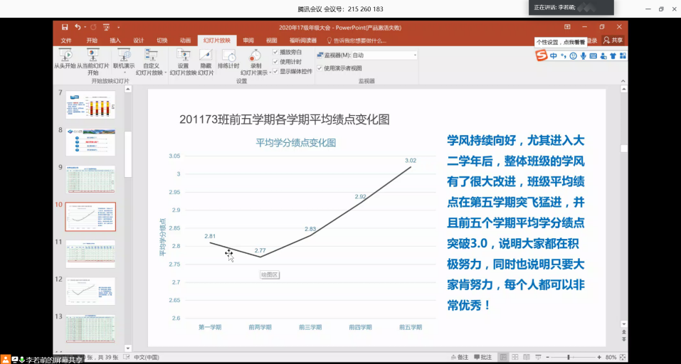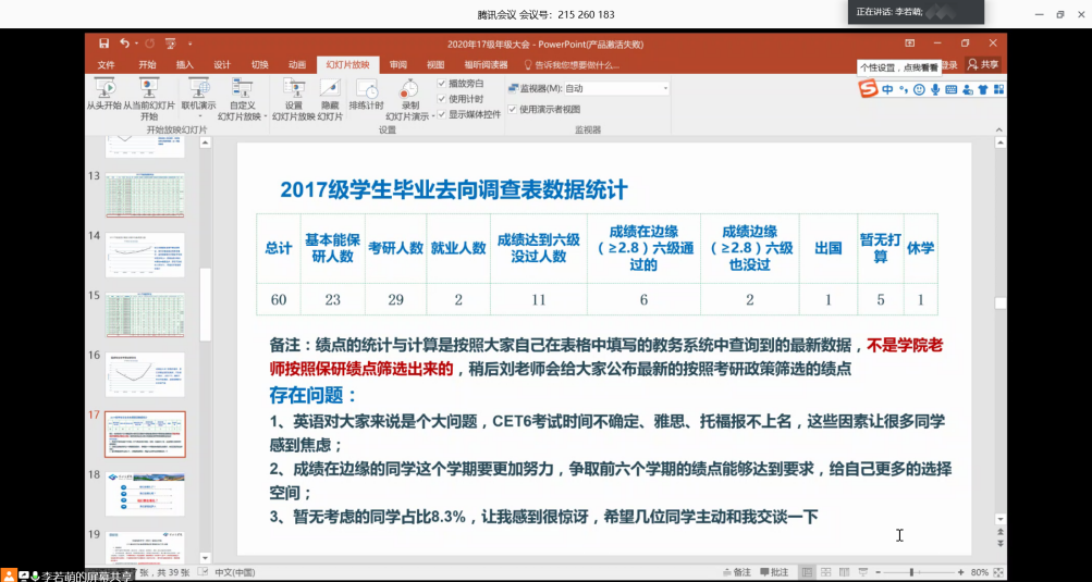 会议第一阶段,李若萌老师分别向大家展示了学院近四届毕业生的升学率情况,结合各个专业前五学期的成绩分布以及2016级同学们的保研、考研、就业情况,用实际的数据向大家进行了详细的展示和充分的分析。总体来说,17级同学们的成绩在前五个学期呈现出明显的上升局势,学风持续向好,李老师鼓励大家还要再接再厉,要为本科生涯画上一个圆满的句号。