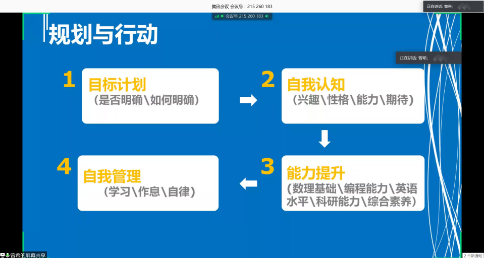 会议第三阶段,学院副院长曾希老师结合同学们的主要问题与困难,毕业意向统计等情况,和同学们就未来发展进行了深入交流,曾希老师强调同学们要对自己做出准确的判断,明确适合自己的目标计划,了解自己的兴趣以及优势。充分利用这段时间提升自己的各方面能力,针对不同的目标做准备,不论是在学习还是在生活中做到真正的自我管理。同时,曾老师也从明确目标计划,保持高的兴趣和学习效果,综合能力的提升以及良好的自我管理四个方面给同学们提供了切实可行的建议,最后为大家布置了制作个人简历的小任务。