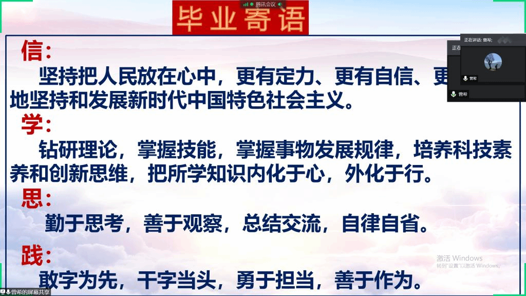 课上,曾希老师指出,同学们正处于“吾十有五而志于学,三十而立”的阶段,是青春的黄金时光,是努力学习、提升自我的最佳时间段,也是整个社会力量中最富有朝气和希望的人,应该努力成长为担当民族复兴大任的时代新人。结合习总书记对青年的寄语:青年一代有理想、有本领、有担当,国家就有前途,民族就有希望,曾希老师鼓励同学们要树立远大理想,热爱伟大祖国,练就过硬本领,锤炼品德修为,担当时代责任,勇于砥砺奋斗。结合学院升学比例较大的实际情况,曾希老师也列举了张建革间谍案、庄宇非法供密案特别提醒同学们要提高国家安全意识,做到明辨是非,心怀祖国。同时希望大家,认真学习贯彻习近平总书记给北京大学援鄂医疗队全体“90”后党员的回信精神,以“信”、“学”、“思”、“践”四个字作为毕业寄语,鼓励大家在新的征程中不断开拓创新,再创佳绩。