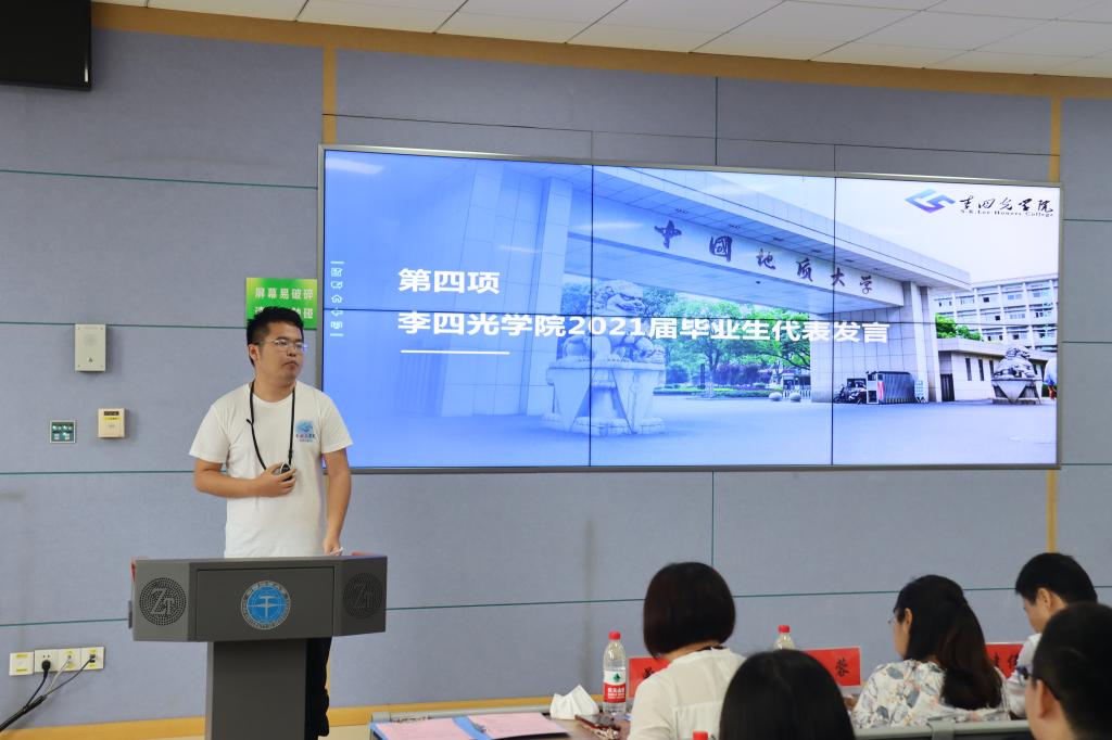 老师们为毕业生们送上了诚挚的祝福,同学们也借此机会向无私奉献的老师、向即将离别的学院和学校表达了内心的感谢与不舍。2021届毕业生代表郑金波、陈奕竹分别上台发表感言,回忆了这四年来在学院度过的美好瞬间。特别是谈到学院的培养模式,郑金波同学说到,“正是借助联合培养的平台,在我的心中埋下了一颗科学的种子,帮助我们点燃科学的梦想。”来自学院学生会的宋有朋同学作为在校生代表上台发言,向即将毕业的学长学姐们表达了诚挚的祝贺与感谢,并表示会继续传承学院团结奋进的优良传统,用学长学姐对待他们的真诚去对待学弟学妹,让betway西汉姆联官网成为每个李院人心灵的港湾。