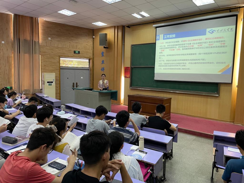 接着,学院辅导员陈思静老师给同学们详细介绍了今年学院与学校的社会调查和社会实践的安排与变化。她从工作安排、工作要求、调查VS实践、指导老师安排等方面展开介绍,她强调社会调查是所有同学必须修读的课程,也是同学们深入理解坚持中国特色社会主义道路,坚持改革开放、坚持社会主义市场经济体制、坚持共同富裕,坚持构建创新型国家重要意义的机会。同时也提醒同学们在开展社会调查期间首先要以安全为重,不前往中高风险区开展调查。