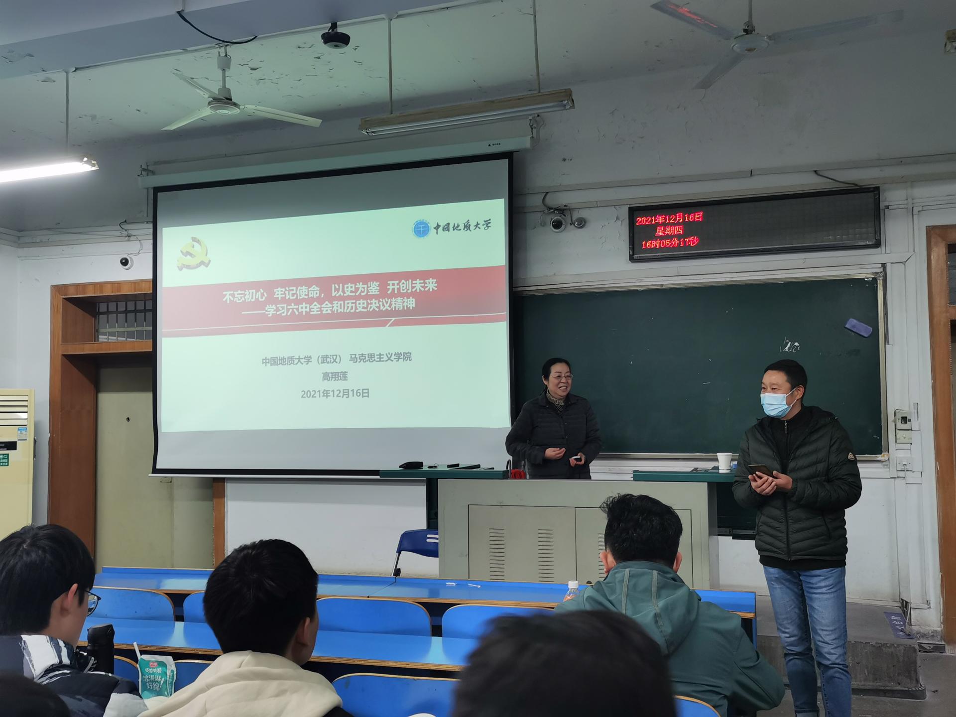 高翔莲从十九届六中全会的重大成就和意义切入,向学生介绍了十九届六中全会在两个百年奋斗目标交汇处召开的时代背景,重点解读了全会通过的《中共中央关于党的百年奋斗重大成就和历史经验的决议》,强调了《决议》的三句定性、两个鲜明特点和一个突出亮点,通过与前两个决议对比分析了新《决议》的主要内容和重大创新。她讲到,《决议》深刻揭示了“过去我们为什么能够成功,未来我们怎样才能继续成功”,深刻揭示了中国共产党为什么“能”、马克思主义为什么“行”、中国特色社会主义为什么“好”等重大问题,是一篇光辉的马克思主义纲领性文献,是新时代中国共产党人牢记初心使命、坚持和发展中国特色社会主义的政治宣言。她指出,党的十九届六中全会对于全党统一思想、统一意志、统一行动,团结带领各族人民以史为鉴,开创未来,在新时代更好地坚持和发展中国特色社会主义具有重大而深远的影响。