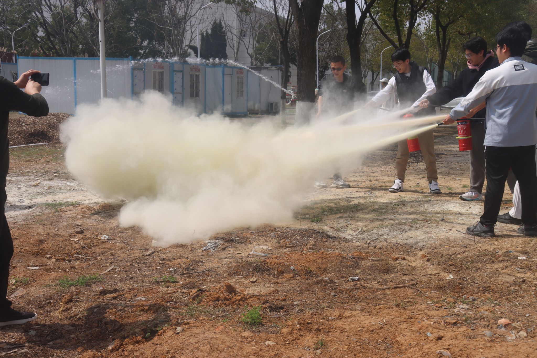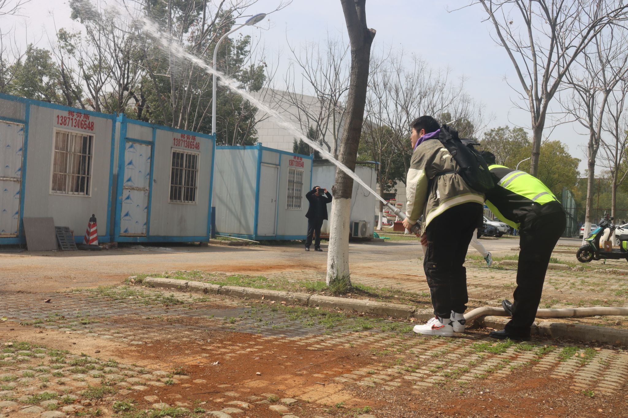同学们亲身体验消防水枪及灭火器的使用