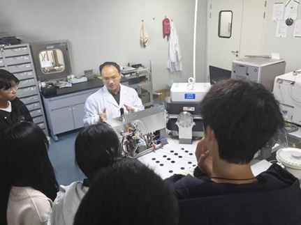 听完陈国雄副主任对实验室的总体介绍,同学们分别在胡贝宁,祝华壮,王骏三位研究生的带领下,参观了地球深部实验室、激光微区分析实验室、矿床微区分析实验室、电子探针实验室、场发射扫描电镜实验室、稳定同位素比质谱仪实验室,同学们不仅近距离聆听了老师们的介绍,还亲自参与了实验过程。
