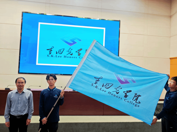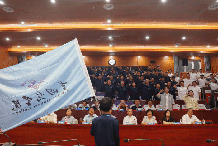 谢树成院士为新生代表授旗,在代表betway西汉姆联官网的蓝色院旗下,全体2025级新生在2022级优秀学生代表曾竑堃同学的领誓下,以青春的名义承诺践诺。