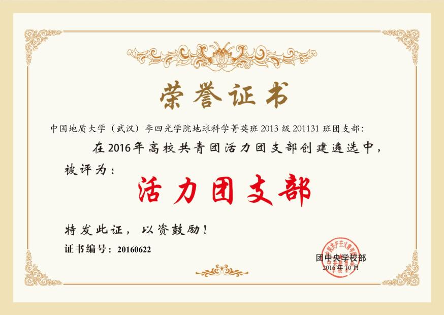 热烈祝贺betway官网201131班团支部在团中央2016年开展的高校“活力团支部”创建遴选活动,获得全国高校“活力团支部”荣誉称号!特此报喜!祝贺他们,也希望其他团支部以他们为榜样,把我们的支部建设得更加充满活力、更加坚强有力。