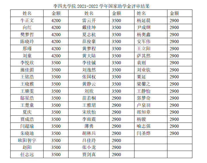 根据本科生院《关于开展2021-2022学年国家奖助学金评选工作的通知》要求,依据国家助学金评选办法,国家助学金金额每生每年在2000元至4500元范围内确定,不可分档超过4档,不可突破上下限额。本着“以学生为本,资助优先”的原则,综合学生贫困认定等级,学院奖助学金评审委员会将资助金额在原评定资助标准上进行了适当调整。特殊困难认定学生给予每人4200元资助,困难认定学生给予每人3500元资助,一般困难认定学生给予每人2900元资助。