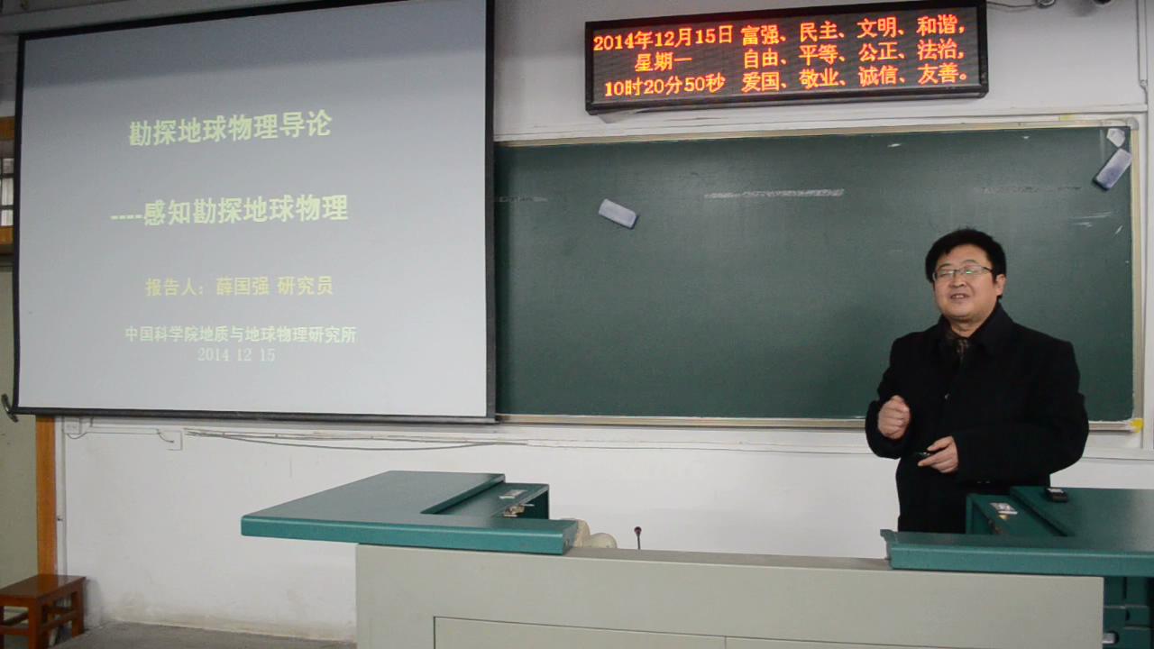 随后是薛国强老师给同学们带来的勘探地球物理导论课。考虑到同学们接触专业知识不多,在第一部分“感知地球物理”中,薛老师用幽默的语言和生动的例子,深入浅出地介绍了地球物理在军事国防、海洋科考、矿产资源的勘察、工程以及航空等方面的巨大作用,让同学们对这门学科有了更深刻的认识。其后薛老师介绍了地球物理勘探的几种方法,如重力勘探、磁法勘探、地震勘探以及电法勘探,引起了同学们对地球物理学的极大兴趣。薛老师还结合自己的工作,提到了地球物理的实践问题。他鼓励同学们学会实践,养成不怕吃苦的精神。