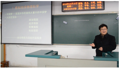 2014年12月,中科院地质与地球物理研究所的研究员薛国强老师为菁英班的同学们带来了勘探地球物理导论课。薛老师用幽默的语言和生动的例子,深入浅出地介绍了地球物理在军事国防、海洋科考、矿产资源的勘察、工程以及航空等方面的巨大作用,激发了同学们对科研工作的热情。该所教育处处长宋玉环老师也应邀为同学们介绍了中科院地质与地球物理研究所的基本情况。