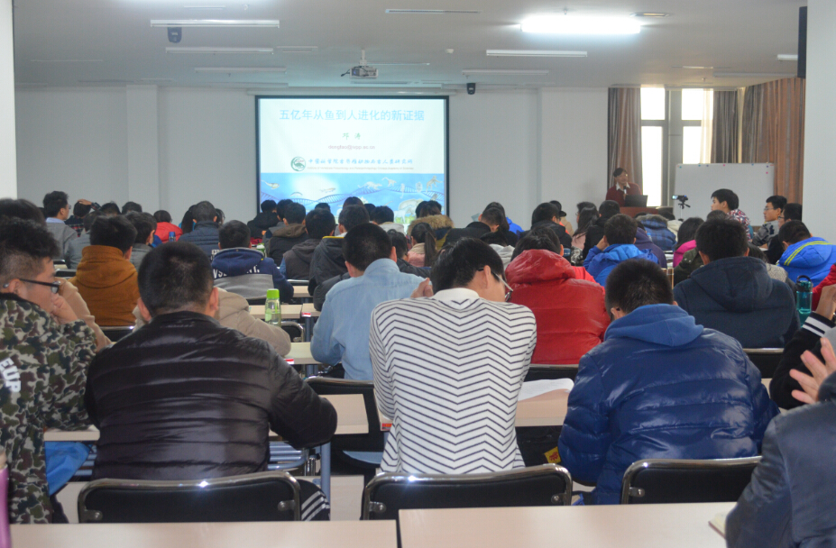 11月26日上午10:00,betway西汉姆联官网2015-2016学年地球科学菁英班“与中科院名师面对面”系列讲座第一讲在图书馆十楼学术报告厅顺利举行,中国科学院古脊椎与古人类研究所邓涛老师为betway官网菁英班学生带来“五亿年从鱼到人进化的新证据”的主题讲座。